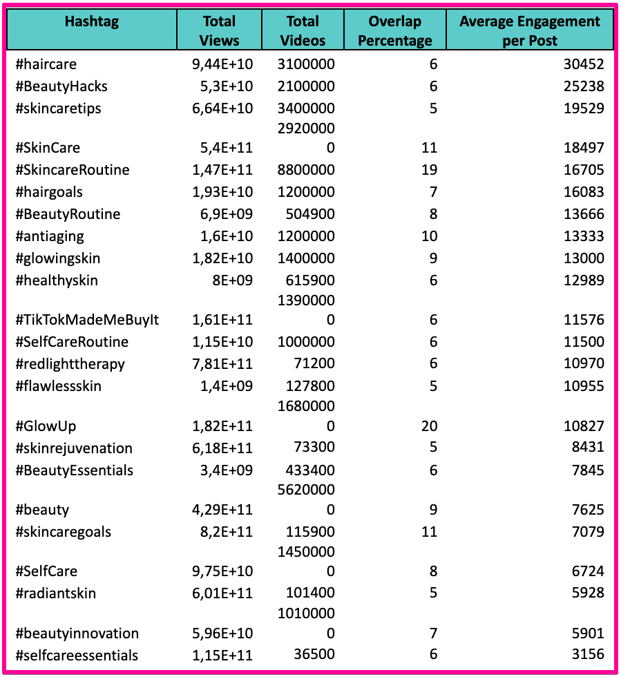 - While broader hashtags like #Skincare (29M videos) or #Beauty (56.2M videos) are excellent for enhancing visibility, niche-specific hashtags such as #beautyhacks (25K average views per post) and #skinrcaretips (20K average views per post) provide significantly higher engagement per post.
