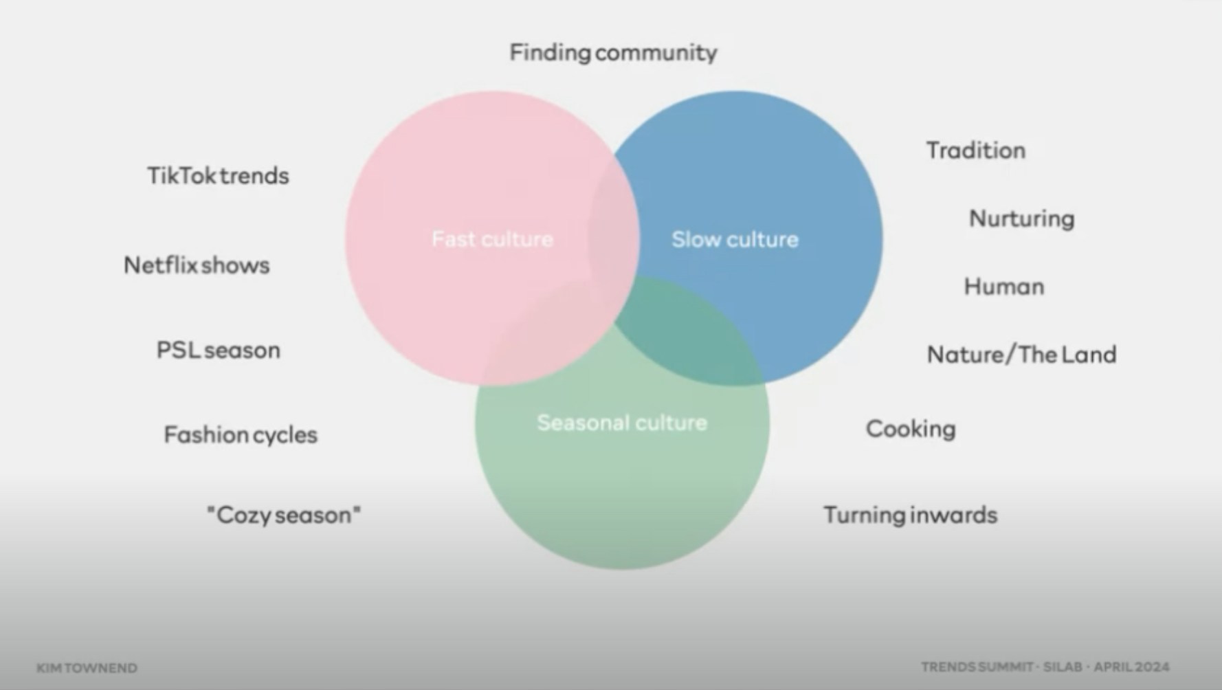 So, to identify such a trend, we must combine fast and slow cultures. One key theme unifying these cultural elements is finding a community that manifests as trends in various ways in multiple channels and formats.
