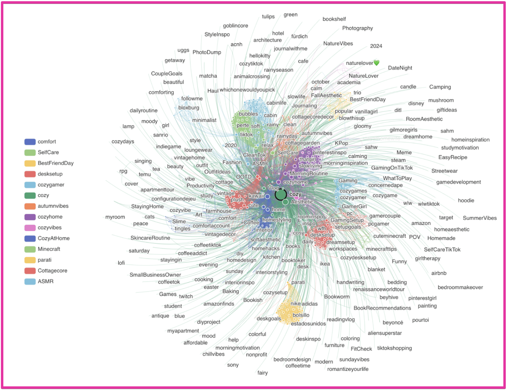 The number of different communities that #cozy is associated with is a great indicator of whether this is a cultural trend or not. The more communities involved, the more likely it is to be cultural.