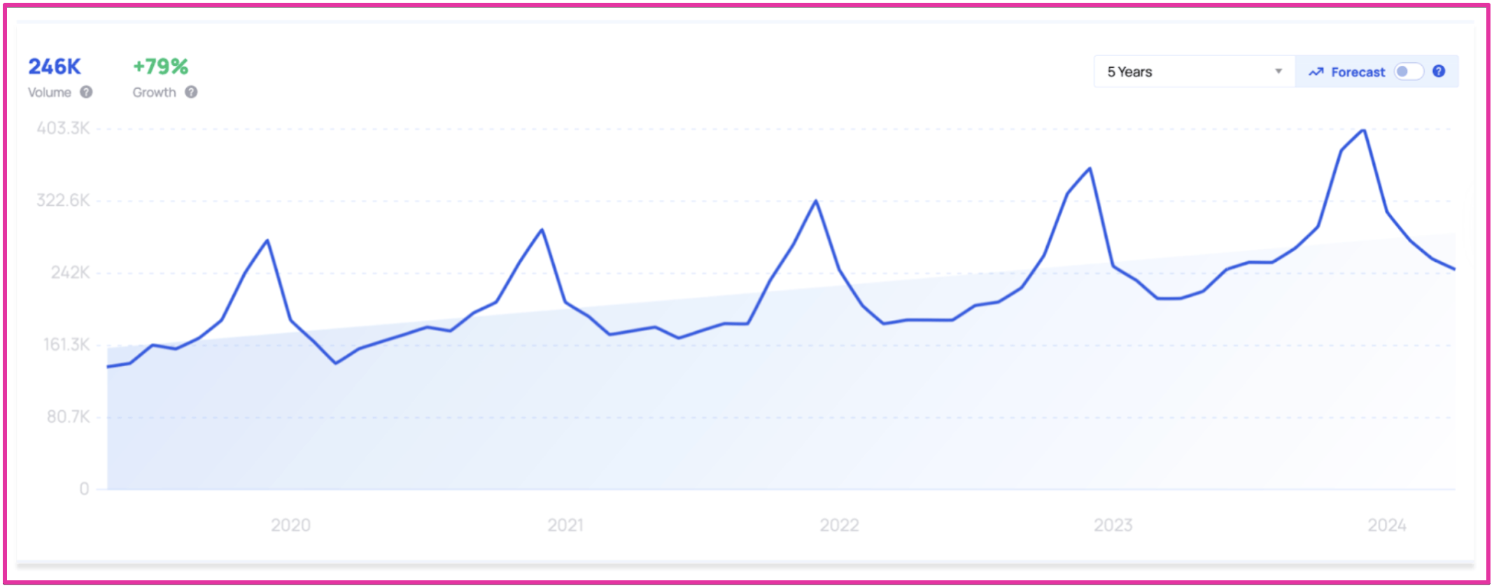 This image above shows Google search data for the past five years around the word ‘cozy’. You’ll see that although it experiences a seasonal spike, it doesn’t die off completely during the warmer months, and that the search volume is growing steadily each year.