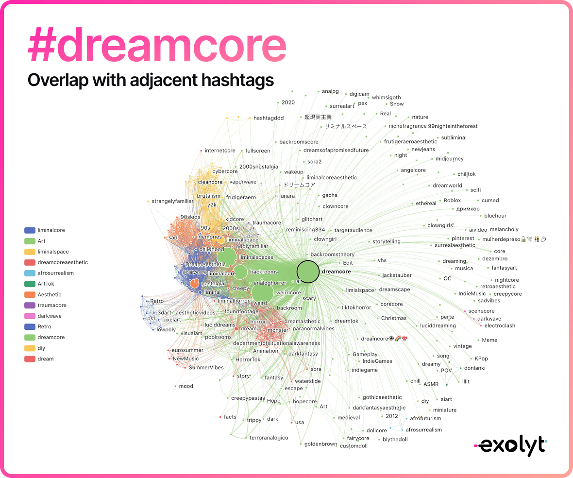 The TikTok audience is a super even split of male and female creators. The top three hashtags we see used alongside #dreamcore, are #weirdcore, #liminalspaces, and #backrooms. Backrooms itself being a creepy pasta internet lore that originated from a 2019 4chan thread. This is the weird internet made accessible via TikTok (it’s also massive on Pinterest and YouTube).