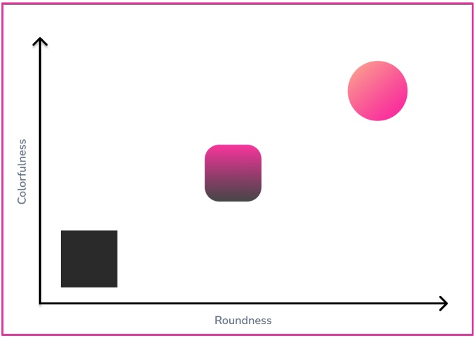 आप जितना दाईं ओर जाएंगे, आकृतियों की गोलाई बढ़ती जाएगी, और जितना ऊपर जाएंगे, आकृतियां उतनी ही रंगीन होती जाएंगी।