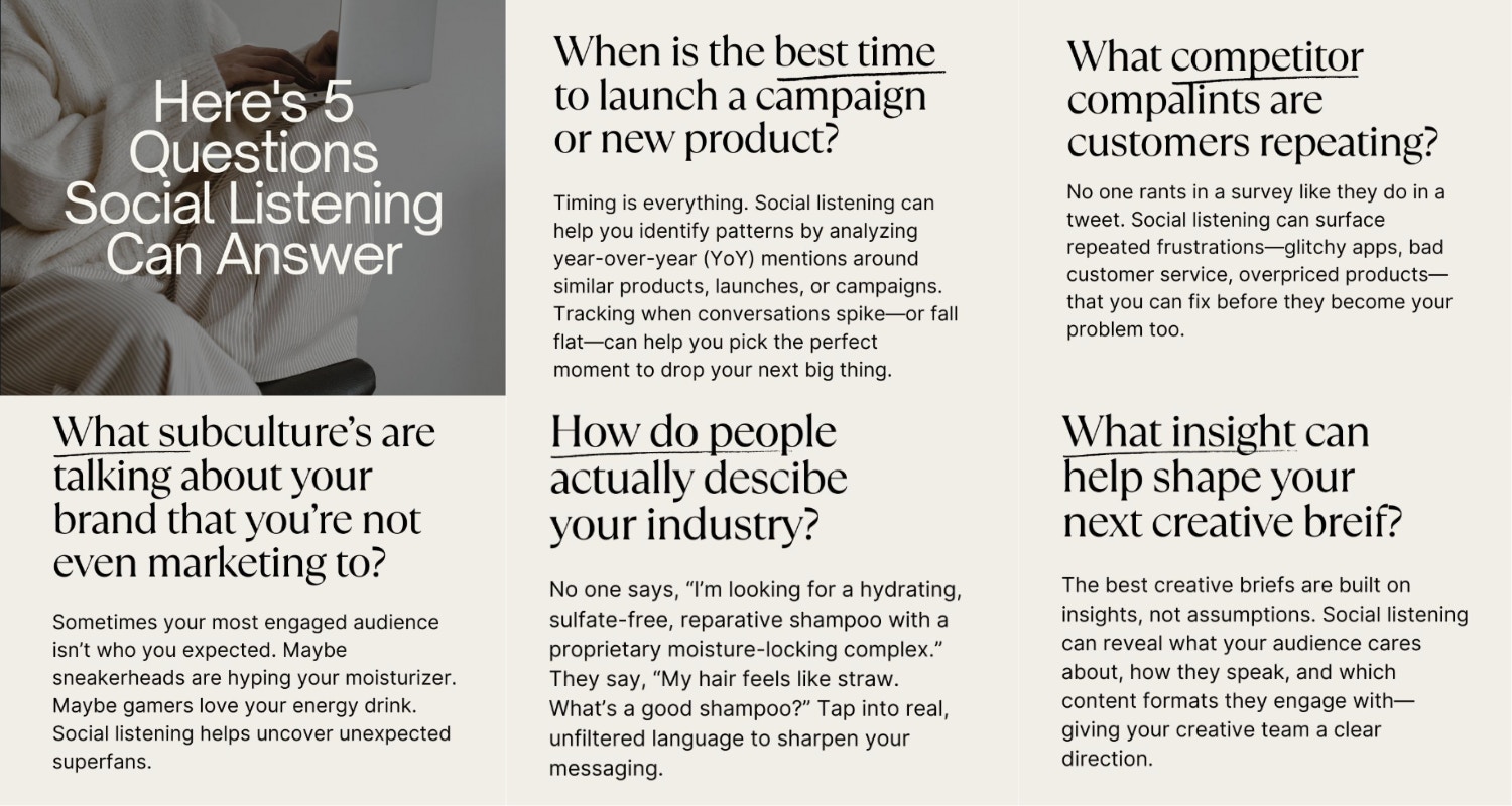 ពិនិត្យមើល សំណួរប្រាំរបស់នាងដែលការស្តាប់សង្គមអាចឆ្លើយបាន ដើម្បីយល់ពីមូលហេតុដែលវាសំខាន់។