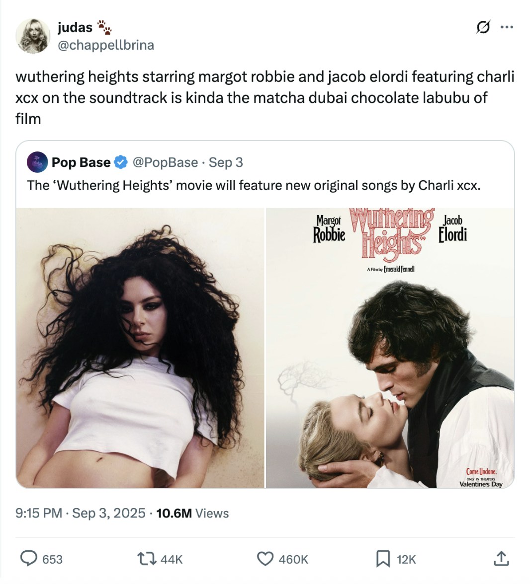 The viral tweet below, created in response to the Wuthering Heights trailer name checks matcha alongside Dubai chocolate and labubu. Matcha is so synonymous with a particular type of internet user that it’s being used as shorthand now.