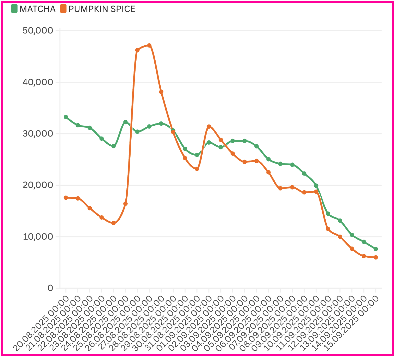 To conclude our analysis, we wanted to explore how matcha compares to Pumpkin Spice as we move from iced drinks to warm beverages for the winter months.