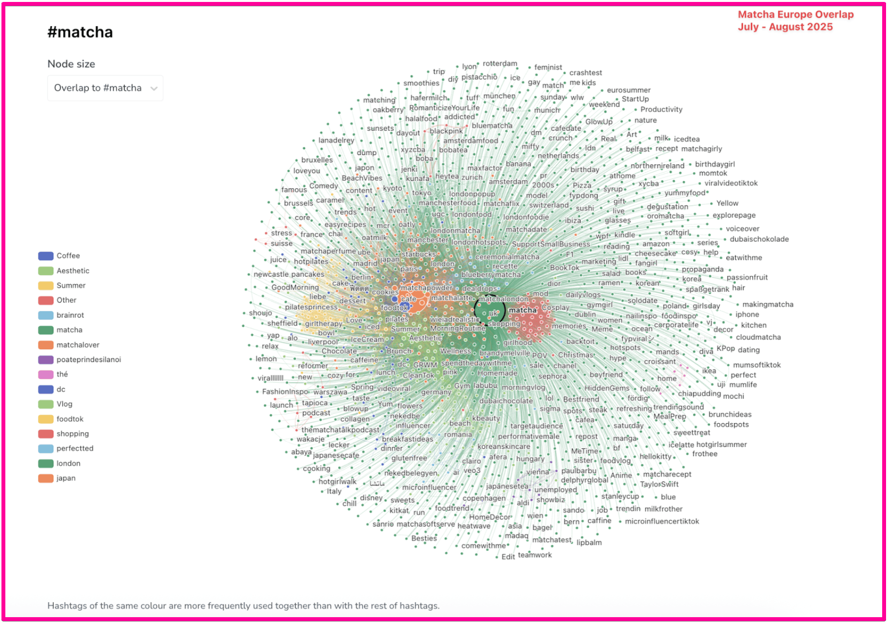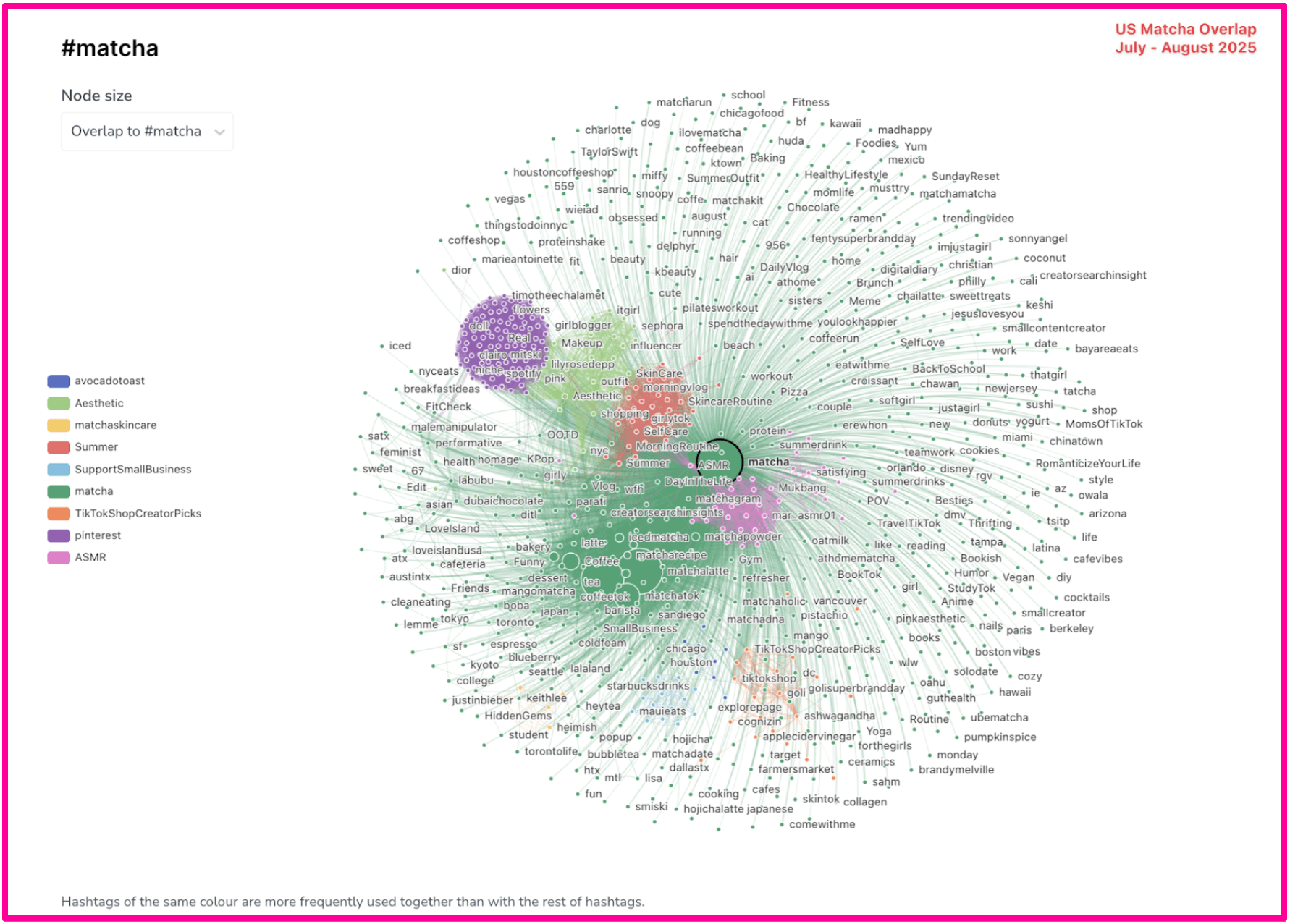 Using Exolyt, I’ve looked at the overlap between matcha and other tags on TikTok during July and August this year.