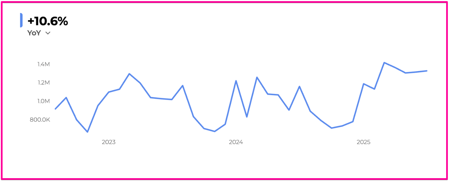 The chart below shows views on matcha and associated terms content on TikTok over the last three years. Mentions were consistent throughout 2023 and into mid-2024, but then things started to trend upward more dramatically. When we reached Spring 2025, things really took off on the platform, with a 376% year-on-year increase in views.