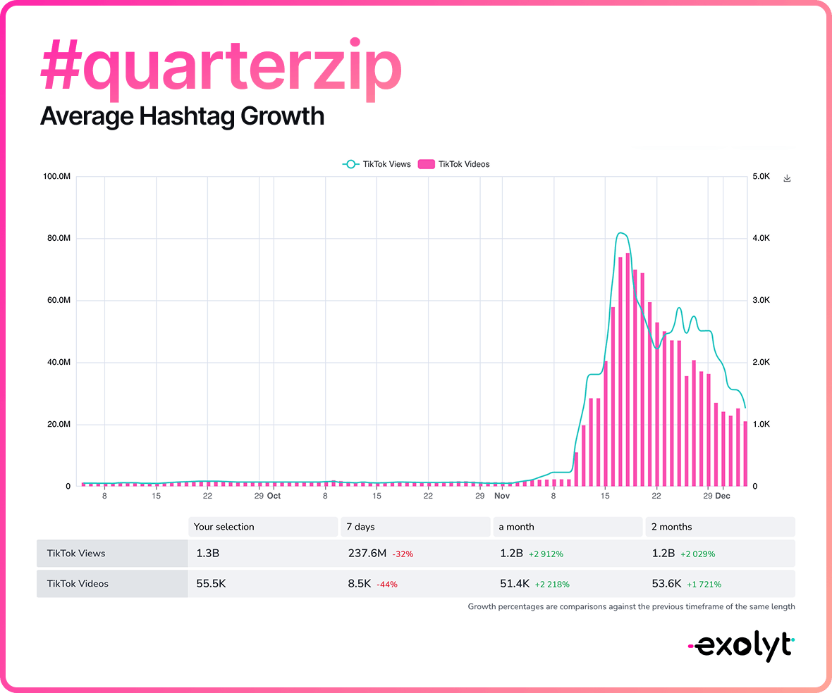 Below you’ll see the growth on TikTok globally around #quarterzip over the last three months. You’ll see that it came out of nowhere in the second week of November and quickly began to dominate the category. In just the last two months it’s amassed 963 million views, and nearly 45k videos.