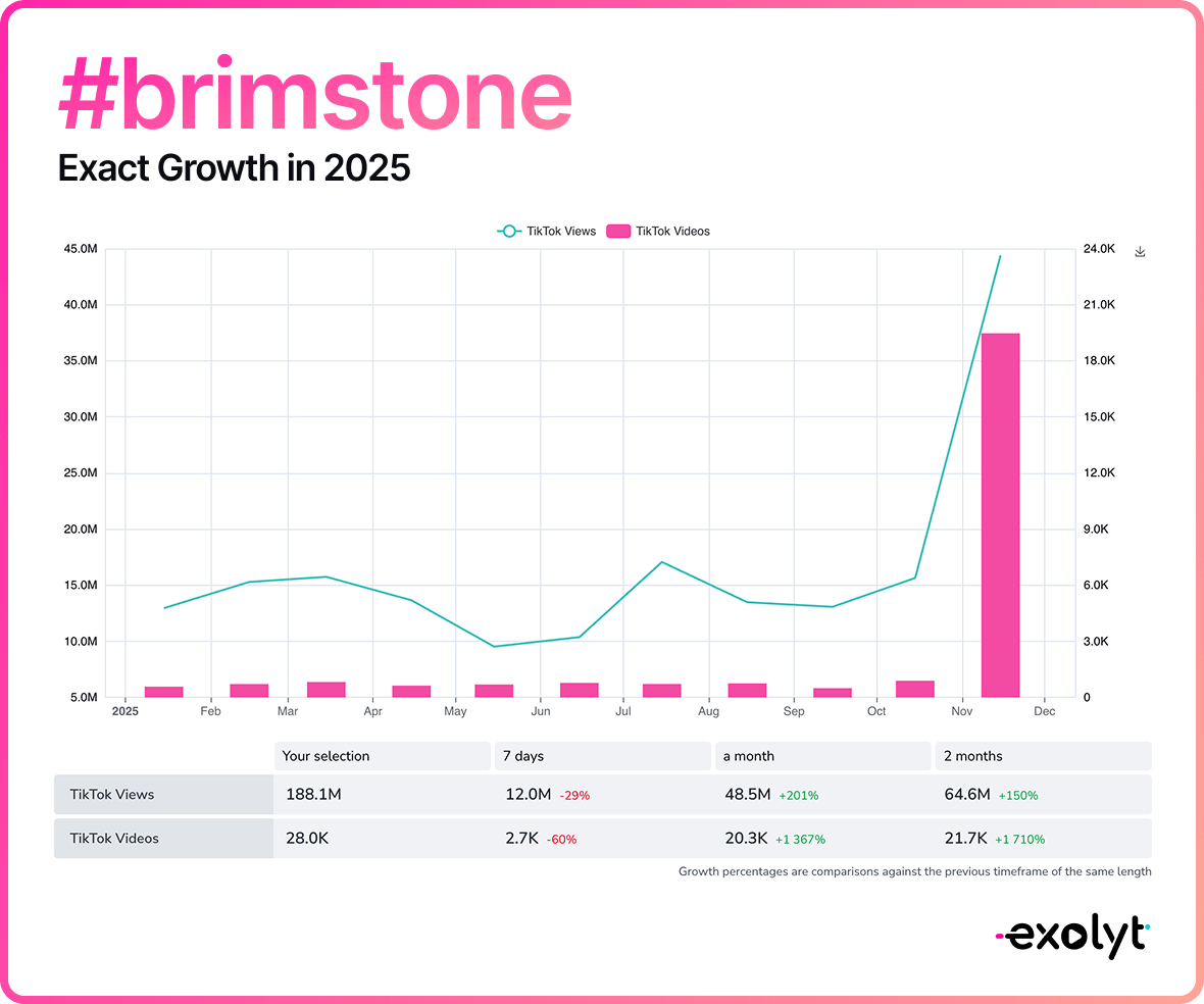 You’ll see from the charts below, that since the books release on November 18th, it’s racked up 18k videos and nearly 40 million views. Over the last two weeks, 3% of all posts that mentioned #booktok also mentioned #brimstone.