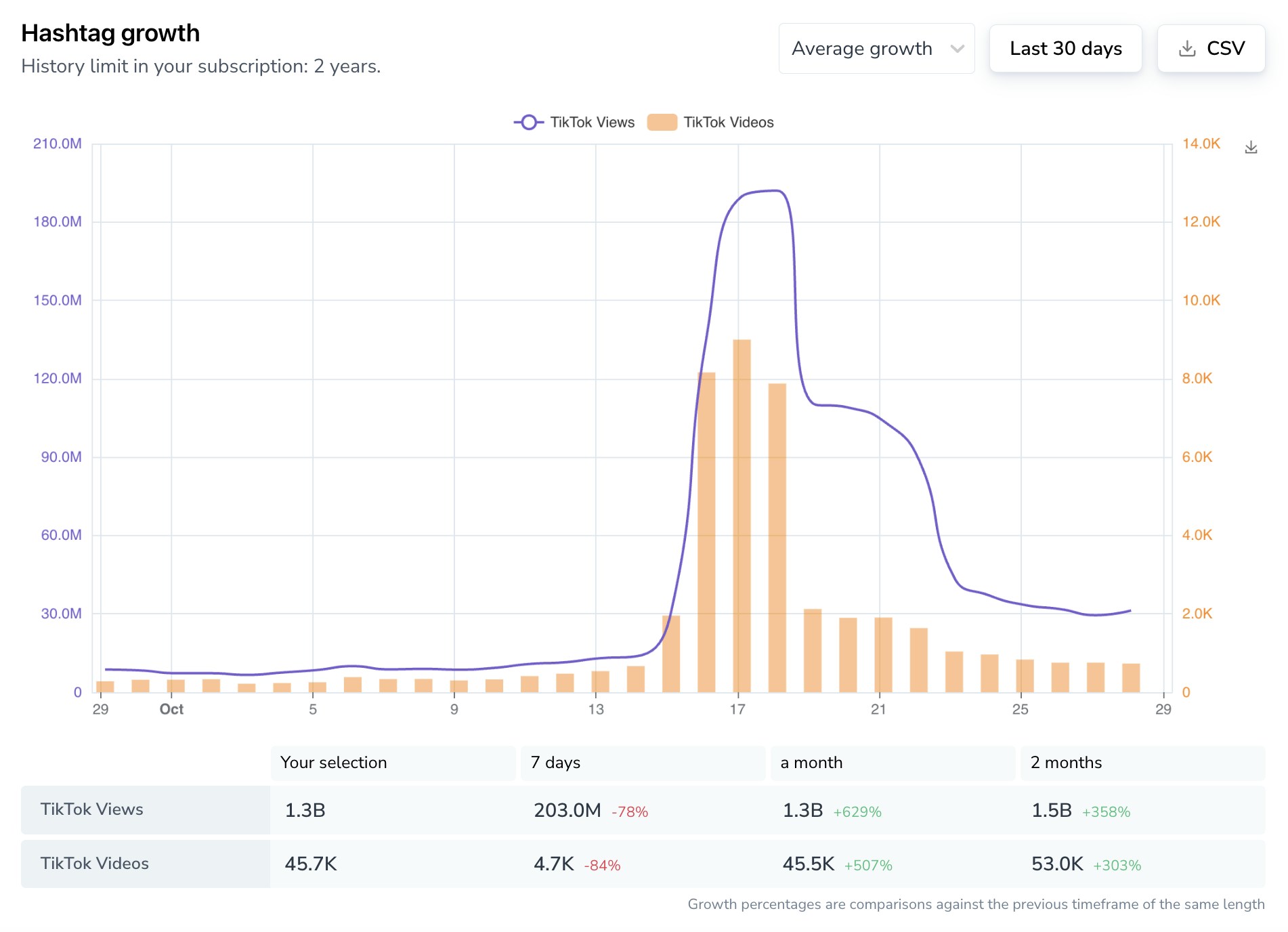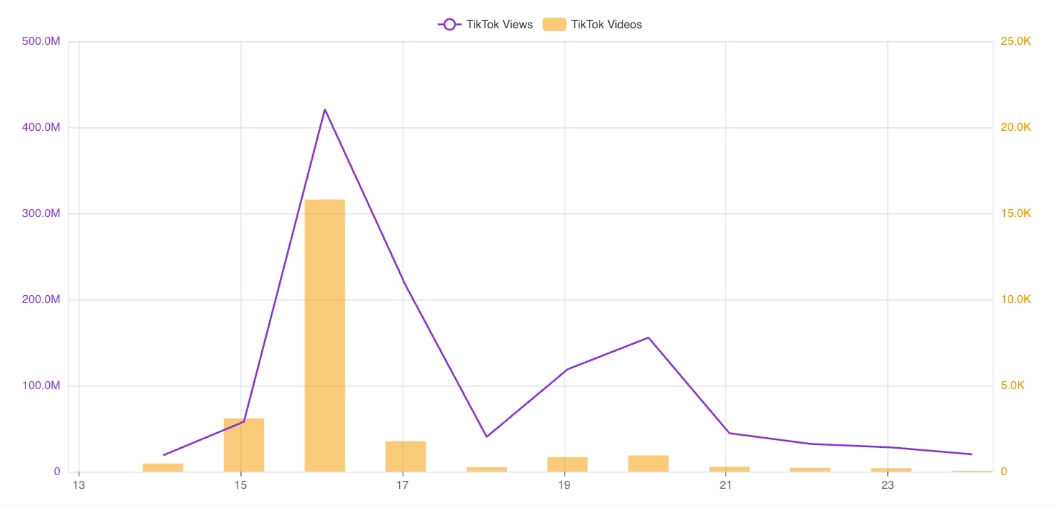 A funcionalidade Hashtag Growth permite-nos avaliar métricas quantitativas básicas, incluindo o volume de publicações e o envolvimento. Nos últimos dez dias (14 a 24 de outubro), foram publicados 23,9 mil vídeos com esta hashtag, totalizando 1,2 mil milhões de visualizações e uma média de 50 209 visualizações por vídeo.