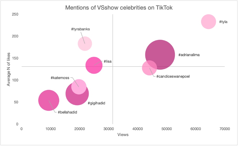 - Além disso, os dados revelam que a frequência das menções não está diretamente relacionada com o envolvimento. Tyra Banks e Kate Moss, embora mencionadas com menos frequência, superam as irmãs Hadid (Gigi e Bella) tanto em visualizações como em gostos.