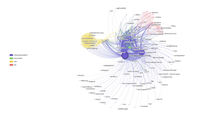 - Zielony klaster: Aniołki Victoria's Secret \n Ten klaster skupia się na kultowych supermodelkach związanych z Victoria's Secret, zwłaszcza Adrianie Limie, której hashtag #adrianalima jest punktem centralnym tej sieci. Inne legendarne postacie, takie jak Bella Hadid, Gigi Hadid, Tyra Banks i Alessandra Ambrosio, są tutaj połączone, tworząc podstawową grupę, która łączy się ze spuścizną VS.