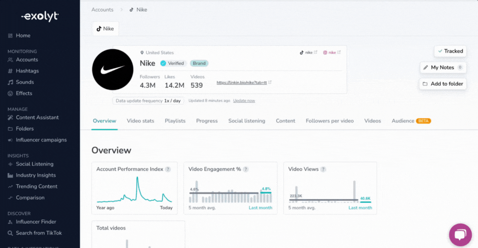 Fonte: Exolyt TikTok Analytics Tool - UGC do perfil TikTok da Nike apresentando a hashtag da marca 'nikefitcheck' com métricas relevantes úteis para monitoramento de desempenho da marca.