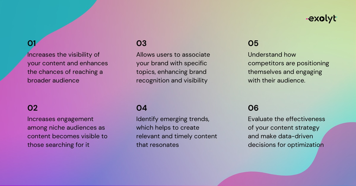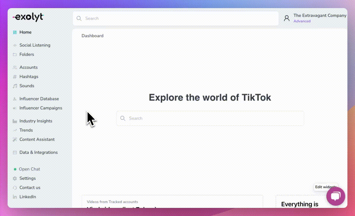 Antes de restringir palavras-chave específicas, tente compreender os tópicos populares e as hashtags relevantes para sua marca ou conteúdo. Felizmente, com os recursos abrangentes da ferramenta analítica TikTok do Exolyt, você pode fazer isso com um único clique.