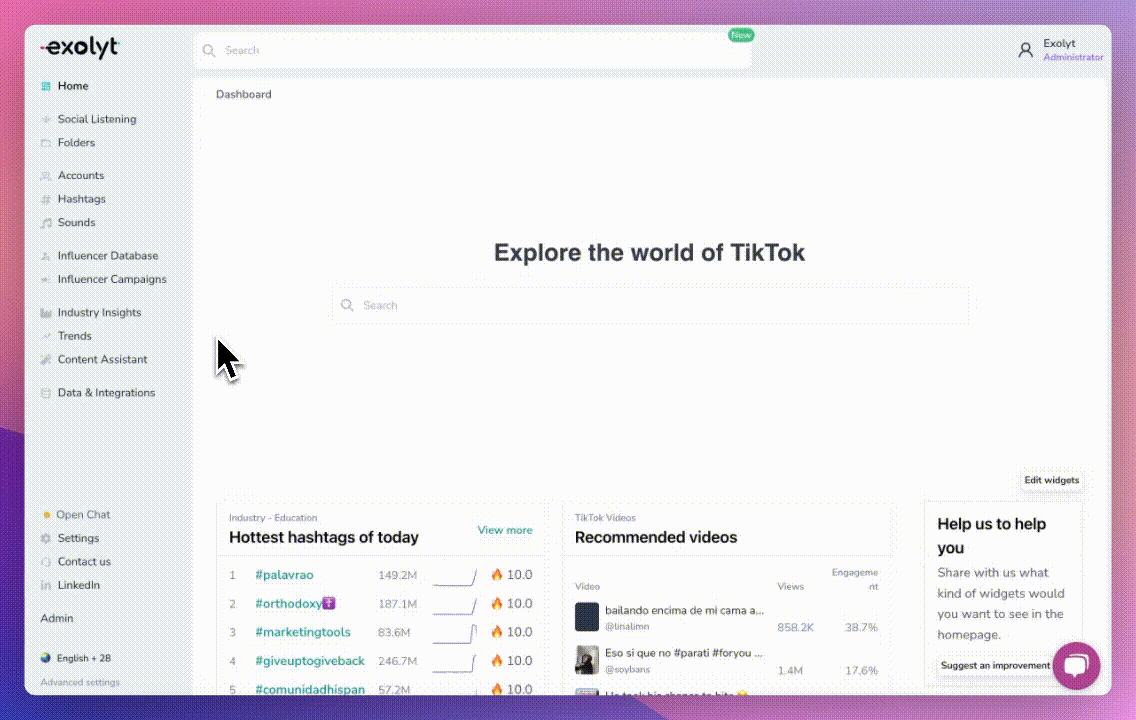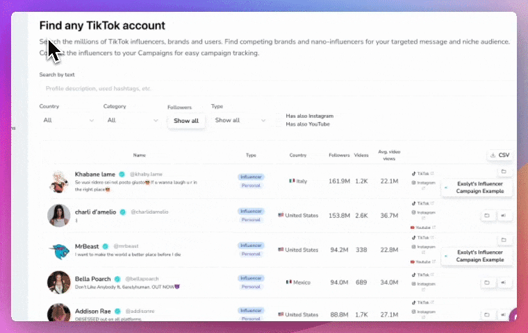Эти шаги упрощаются одним щелчком мыши, если вы перейдете на панель управления аккаунтами Exolyt, чтобы изучить авторов на TikTok.