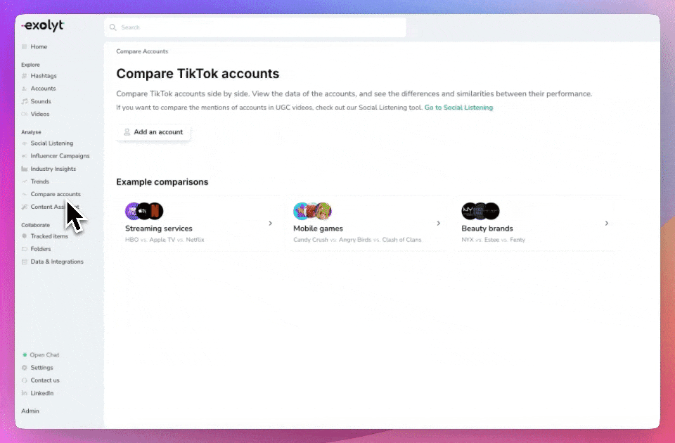 Чтобы узнать, где находится ваш бренд, сравните его с конкурентами. С помощью Exolyt или других инструментов социальных сетей вы можете отслеживать хэштеги и упоминания в категории вашего бренда или напрямую у ваших конкурентов. Вы также можете сравнивать аккаунты с помощью инструментов социального прослушивания, таких как Exolyt.