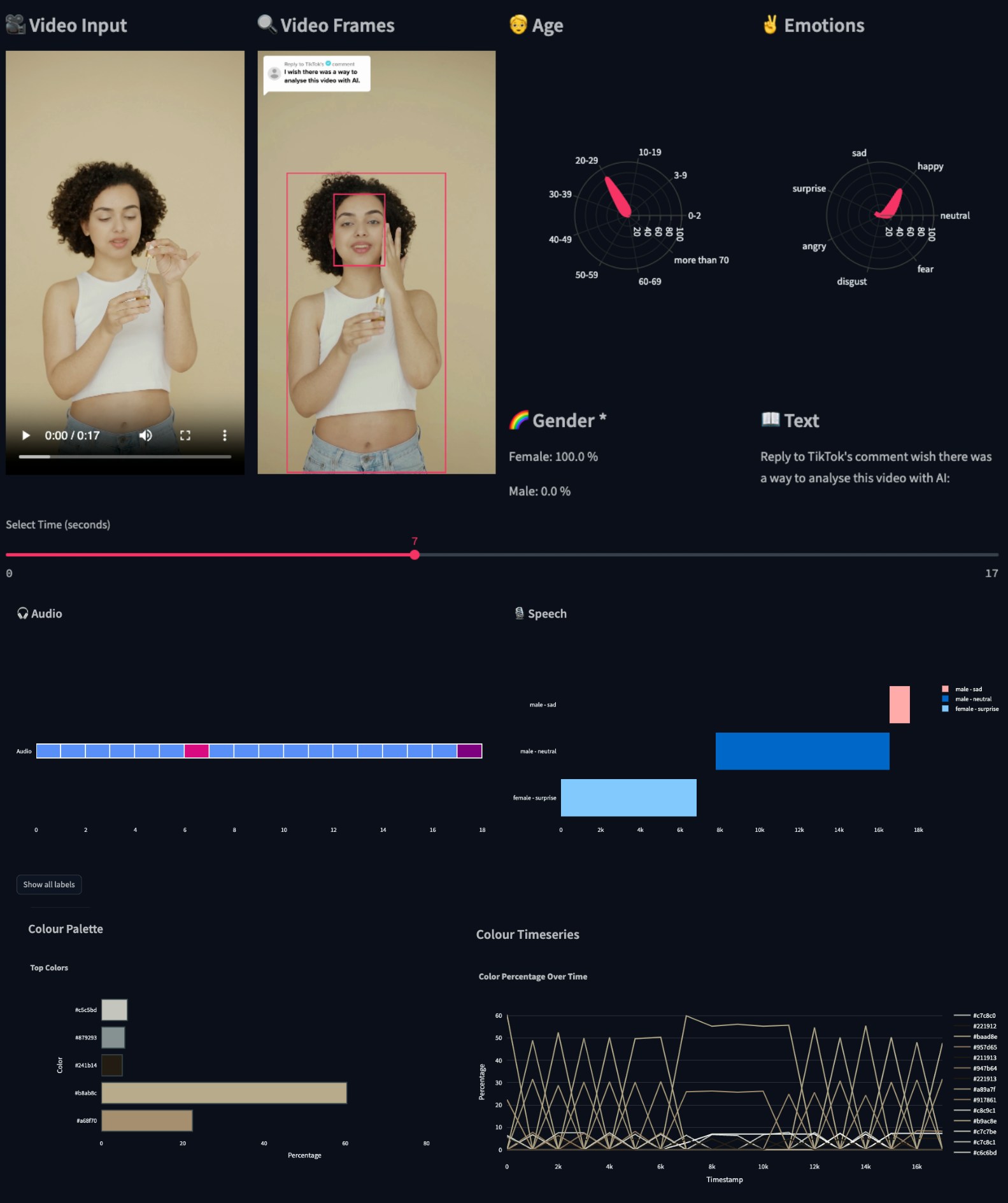 Med hjälp av avancerade datorseendealgoritmer kan vårt videoanalysverktyg exakt identifiera objekt, extrahera texter och demografisk information samt genomföra färg- och ljudanalys inom varje sekund av en TikTok-video. Dessutom kan det göra det möjligt för Exolyts användare att identifiera och klassificera känslor i videon genom att spåra ansikts- och röstkänslor som uttrycks.