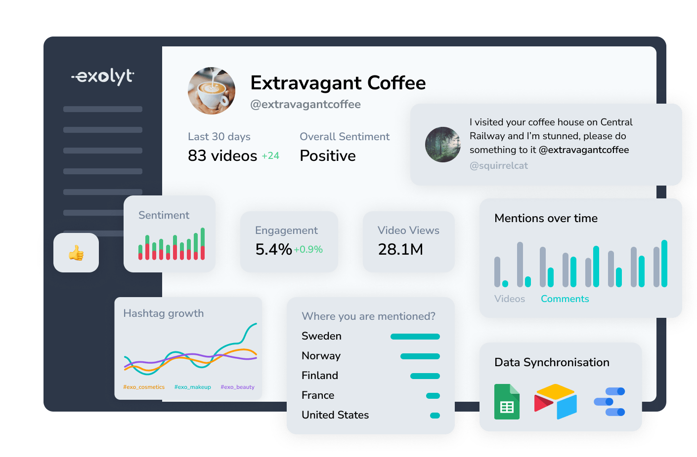Exolyt надає найширше джерело даних TikTok з інтелектуальним визначенням тенденцій та можливостями соціального прослуховування, які можуть розширити портфоліо послуг вашого агентства в соціальних мережах. Запросіть всю свою команду до Exolyt за єдиною фіксованою ціною.
