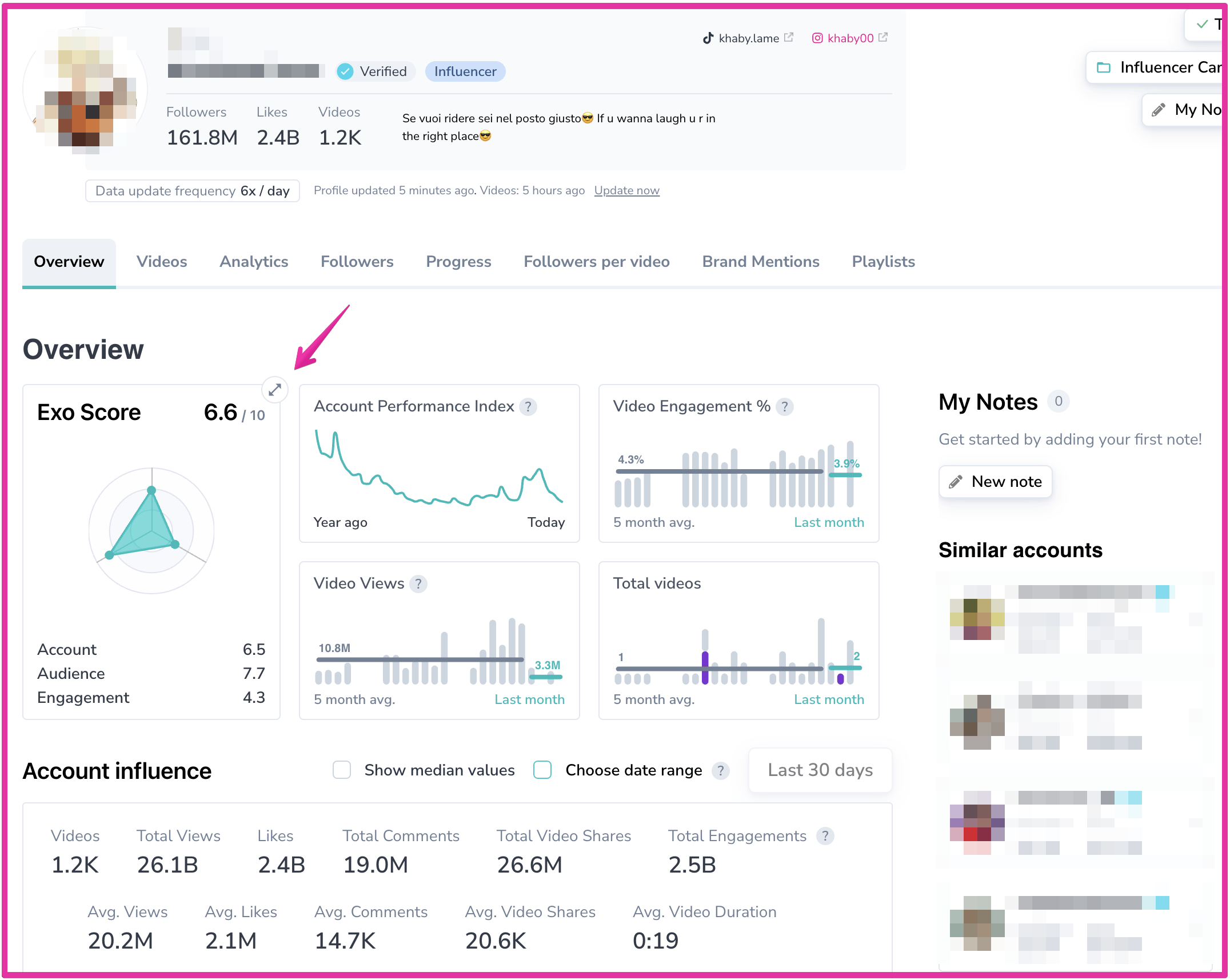 آپ اثر انداز کرنے والوں کا ان کی کارکردگی کے اشاریہ اور مواد کے انداز کے ذریعے یا زیادہ تنقیدی طور پر، ان کے Exo اسکور (Exolyt کی طرف سے منگنی کا جائزہ میٹرک) کا مزید تجزیہ کر سکتے ہیں۔ ایسے متاثر کن لوگوں کو تلاش کریں جن کے سامعین آپ کے ہدف کی مارکیٹ کے ساتھ ہم آہنگ ہوں اور ان کے پاس اعلیٰ معیار کا مواد تیار کرنے کا ریکارڈ ہو۔