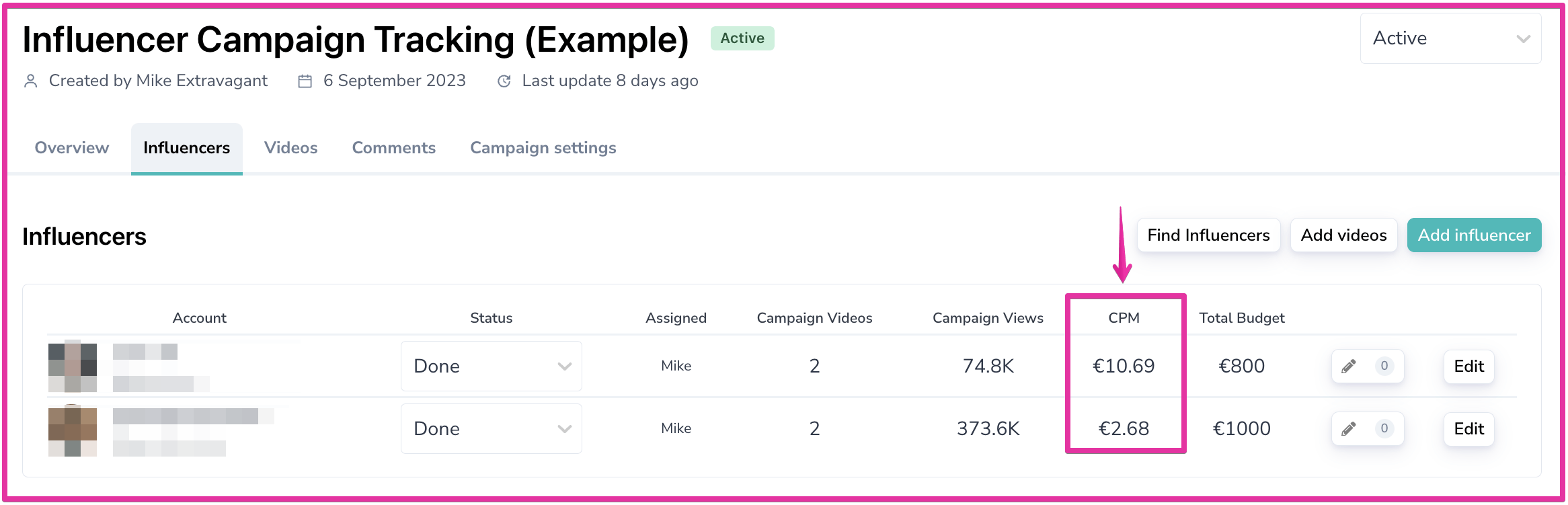 With Exolyt’s Influencer Campaign Tracking features, you can easily track CPM (Cost per mile = Cost per thousand impressions) for individual campaign videos or add all influencer videos you are collaborating with to compare the ROI for each influencer quickly.