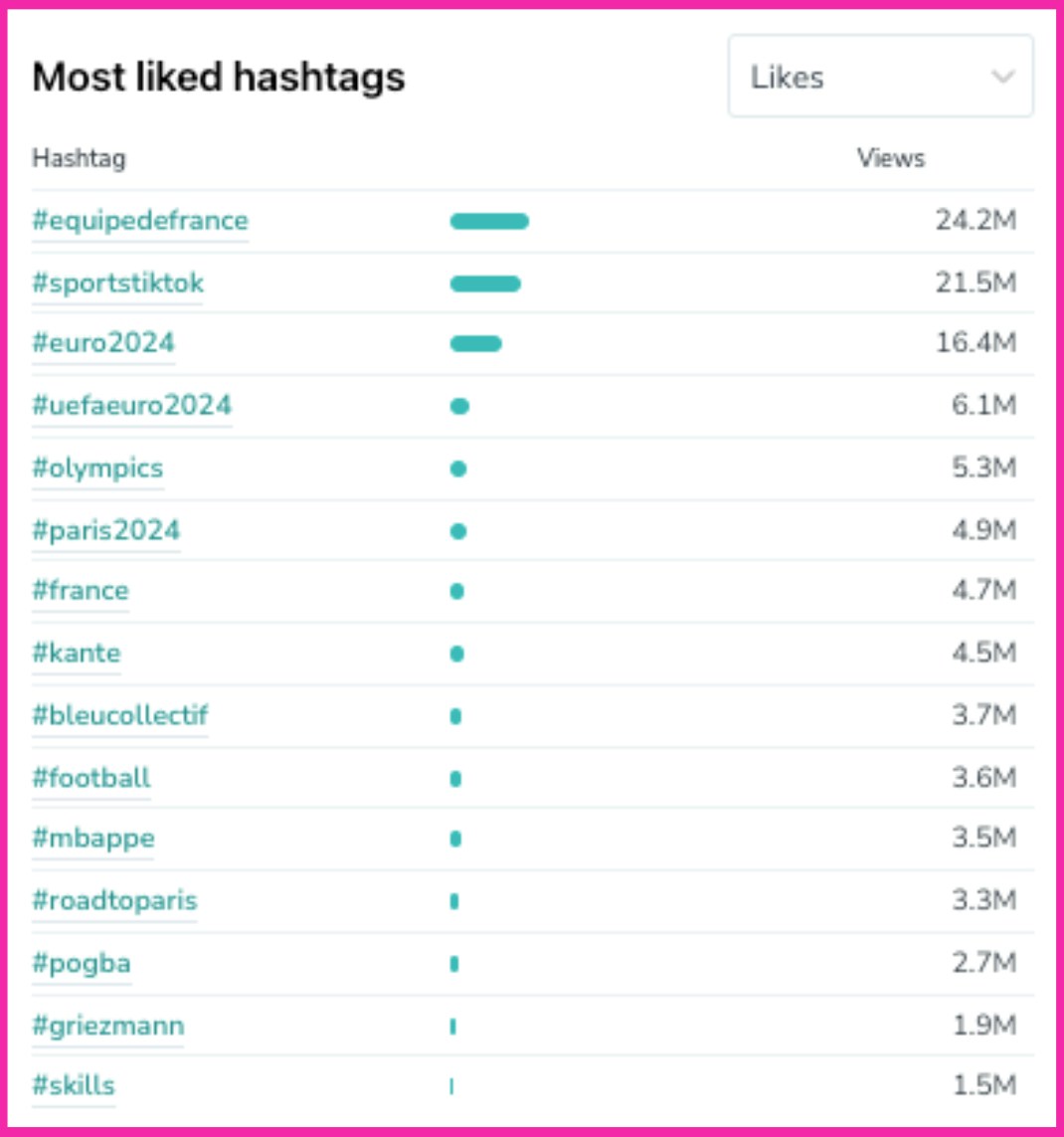 Dưới đây là cái nhìn thoáng qua về các hashtag được yêu thích nhất trên tài khoản của Đội tuyển bóng đá quốc gia Pháp, đội tham dự Giải vô địch châu Âu 2024.